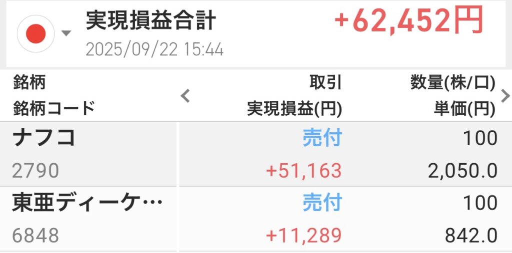 今日は、2銘柄の一部を利確しました。