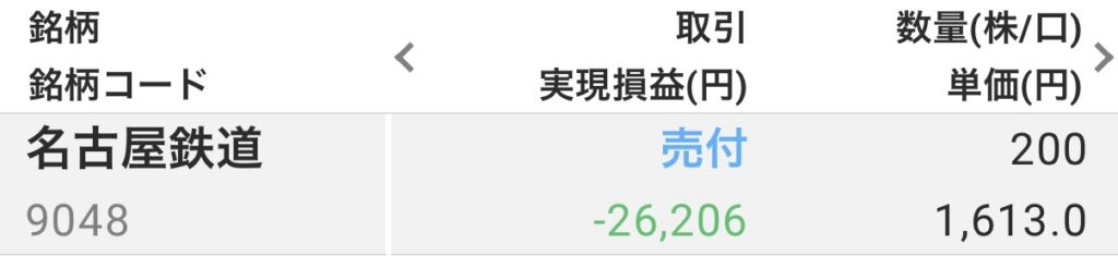 - 名古屋鉄道(9048) 200株@1,613円(-26,206円)