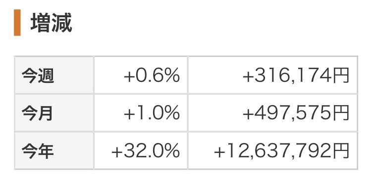 昨年末比では、+1263万円(+32%)となっており、想定を遥かに上回るペースで増えています。