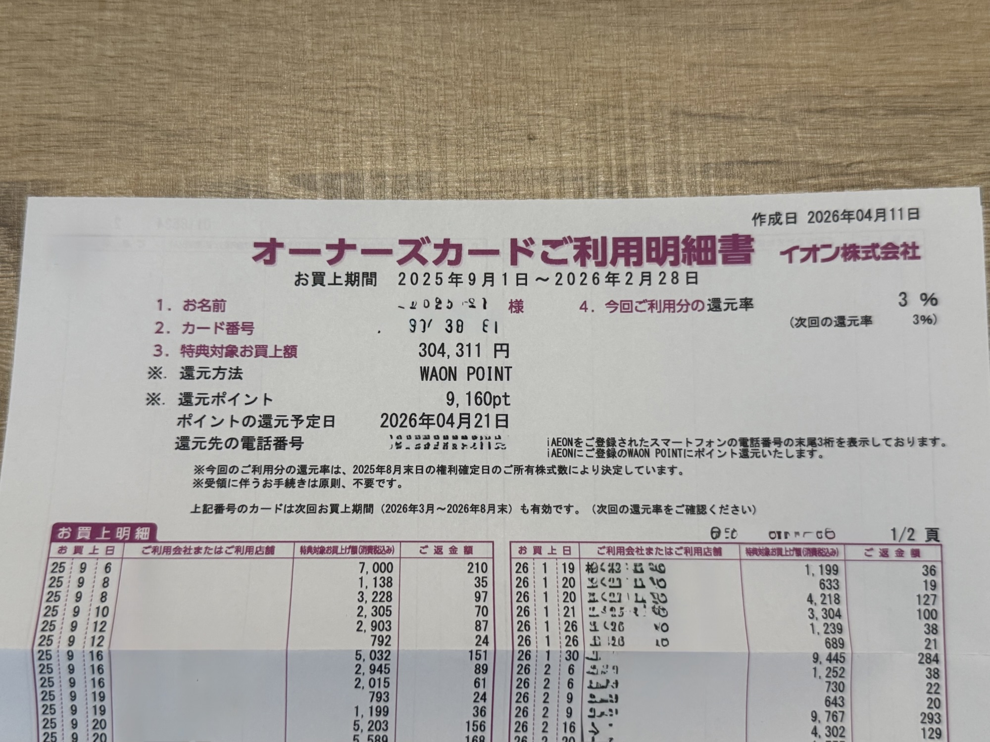 300株保有のため、半年間の利用額304,311円の3%となる9,160ptが還元されます。