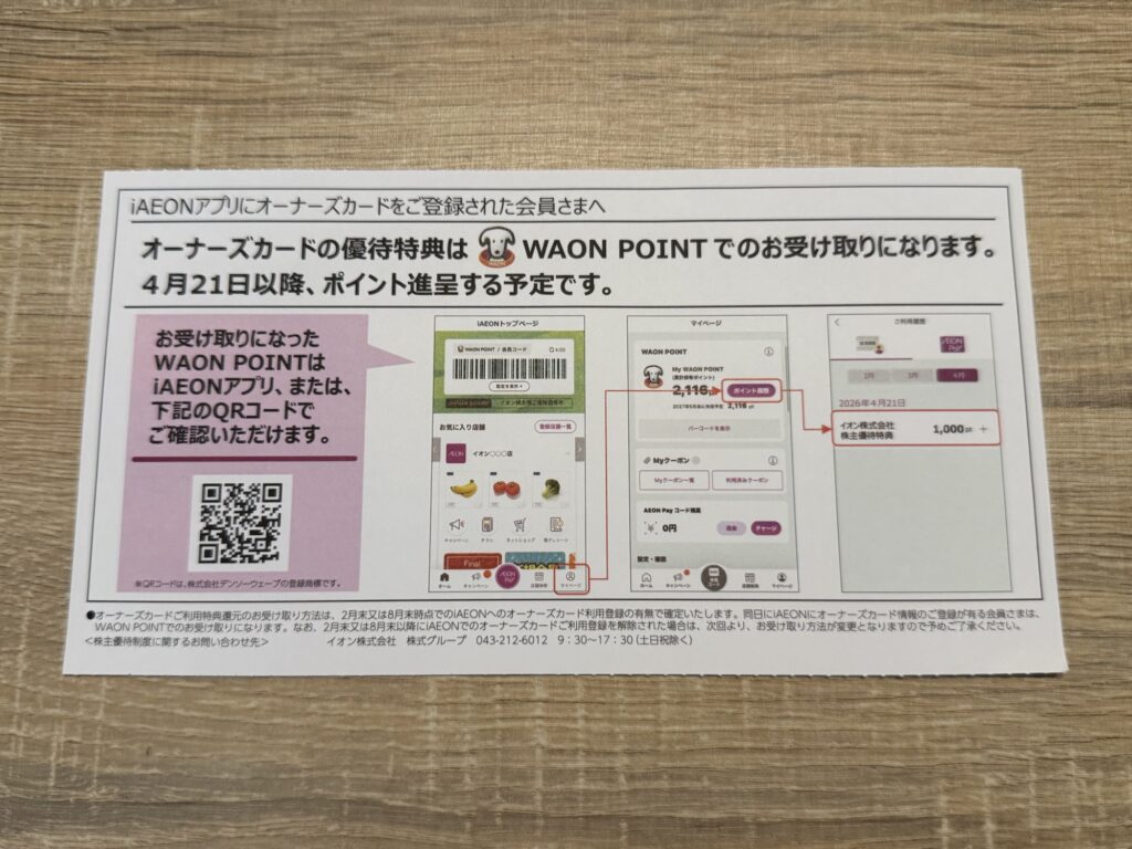 イオン(8267)から株主優待として、WAON POINT付与の案内が届きました。